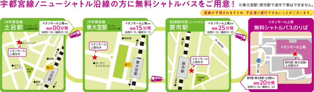 宇都宮線・ニューシャトル沿線であれば、土日祝日限定で無料シャトルバスが出ています。