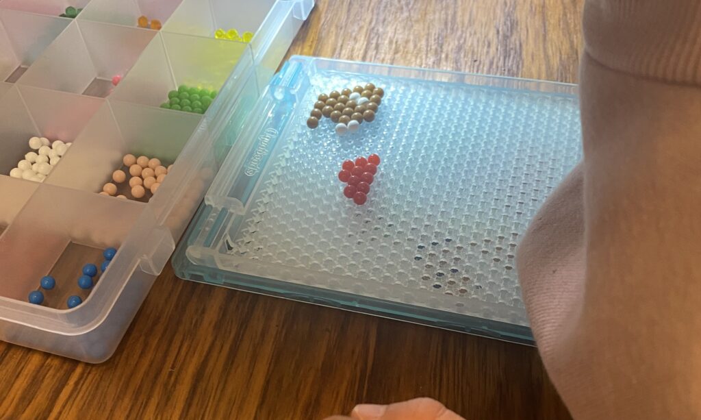 ・パイプ状のビーズを専用トレイに並べてキャラクターを作る