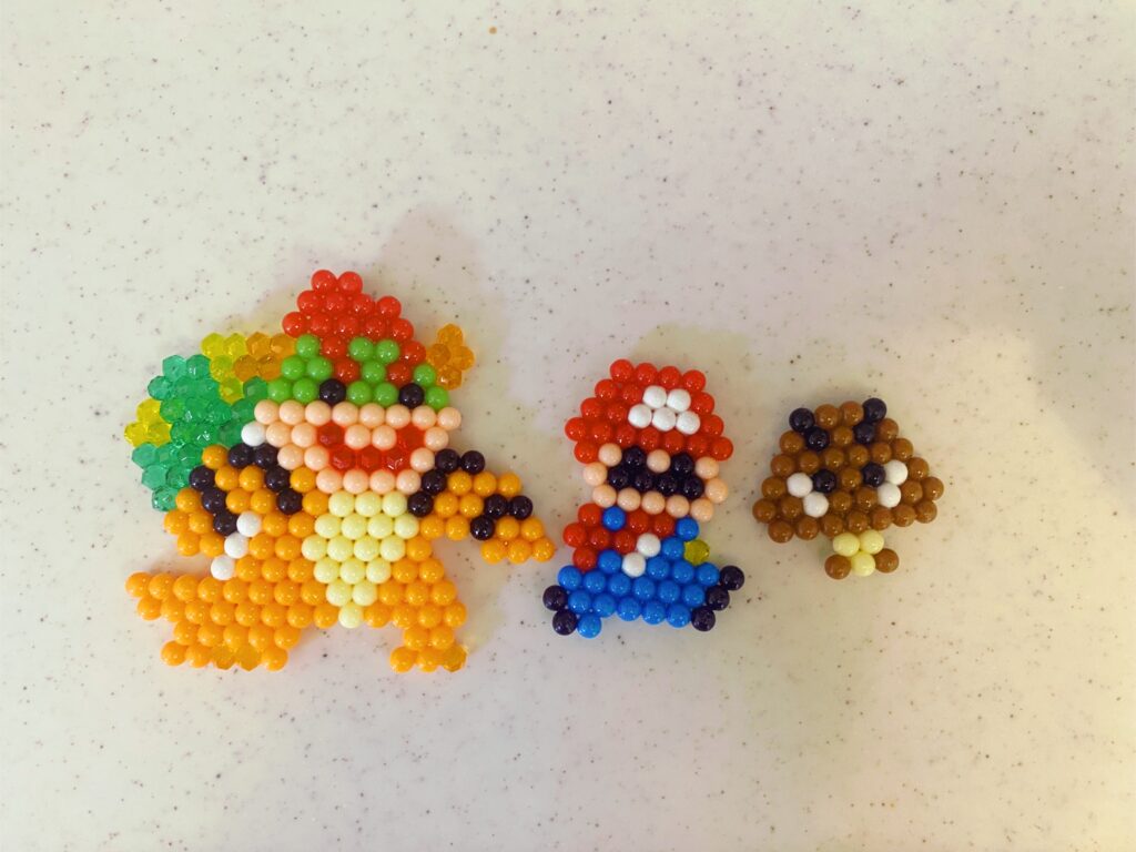 ビーズを図案通りに並べて水を吹きかけて、乾かせばかわいいキャラクターができあがります。