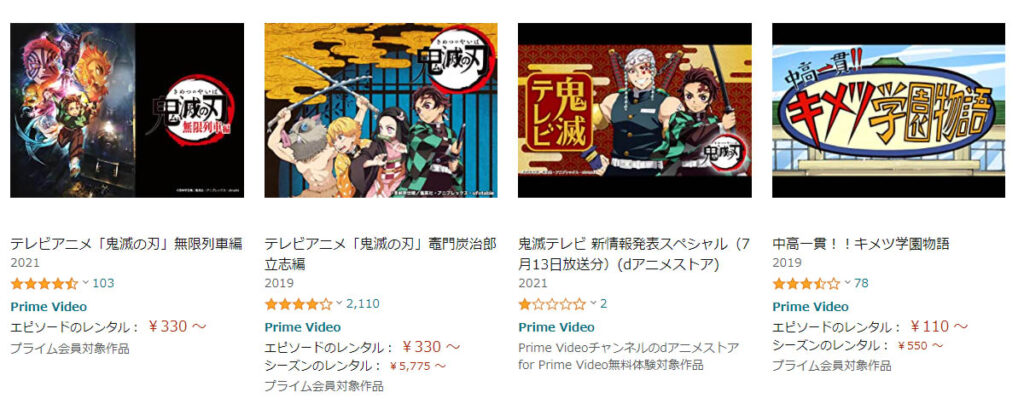 現在、鬼滅の刃のテレビアニメや劇場版無限列車編はプライム会員対象作品となっています。(2021年10月現在)