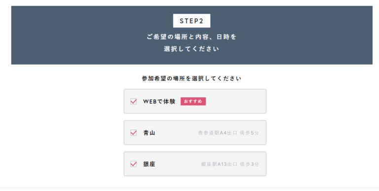場所と内容日時を選択。ここでオンライン希望の方は「WEBで体験」を選択。