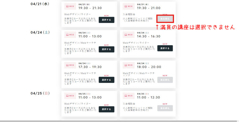 希望の内容と日時のものを選択(満員のものは選択不可)