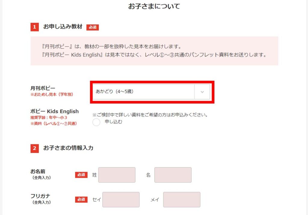 ① 申込ページで教材を1つ選択し、子供の情報などを入力